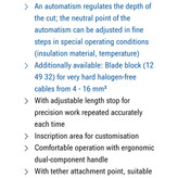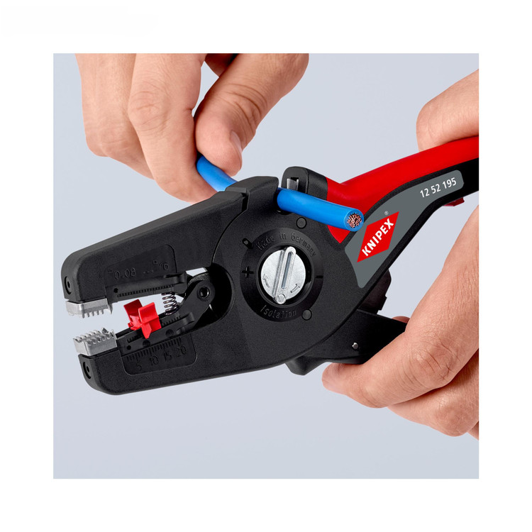 دستگاه به صورت اتوماتیک سیم ها را تا 16 میلی متر مربع بدون هیچ تنظیمی با سرعت و دقت بالا و بدون اینکه سیم هیچ آسیبی ببیند لخت میکند و خودش بر اساس سایز سیم مورد نظر تنظیم میشود.