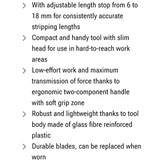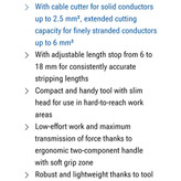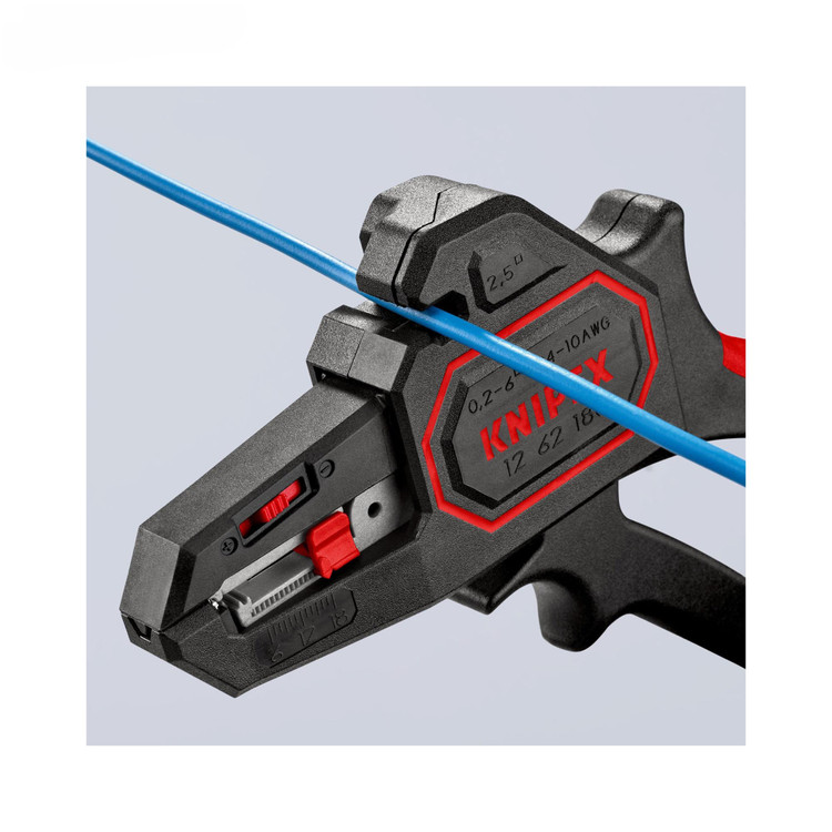 دستگاه به صورت اتوماتیک سیم ها را تا 6 میلی متر مربع بدون هیچ تنظیمی با سرعت و دقت بالا و بدون اینکه سیم هیچ آسیبی ببیند لخت میکند و خودش بر اساس سایز سیم مورد نظر تنظیم میشود.