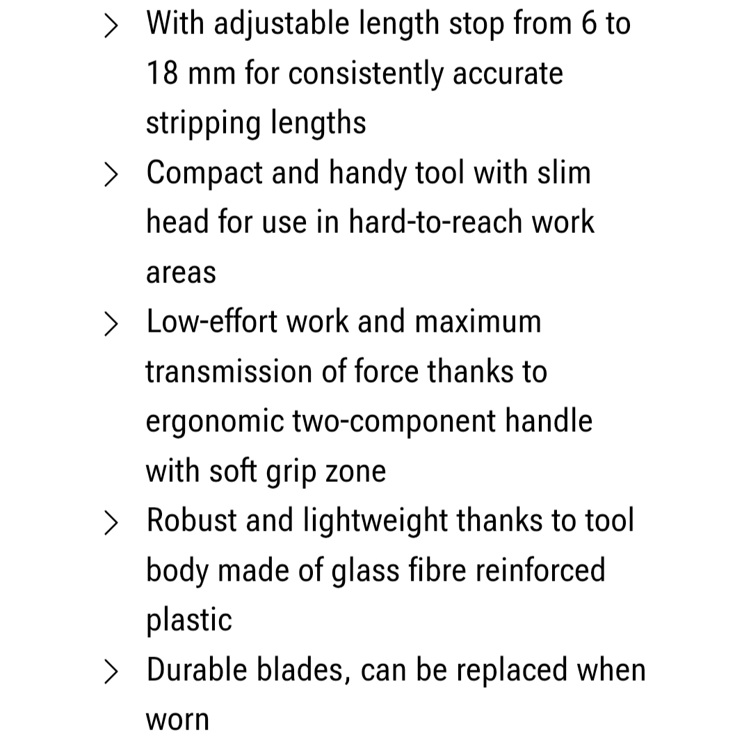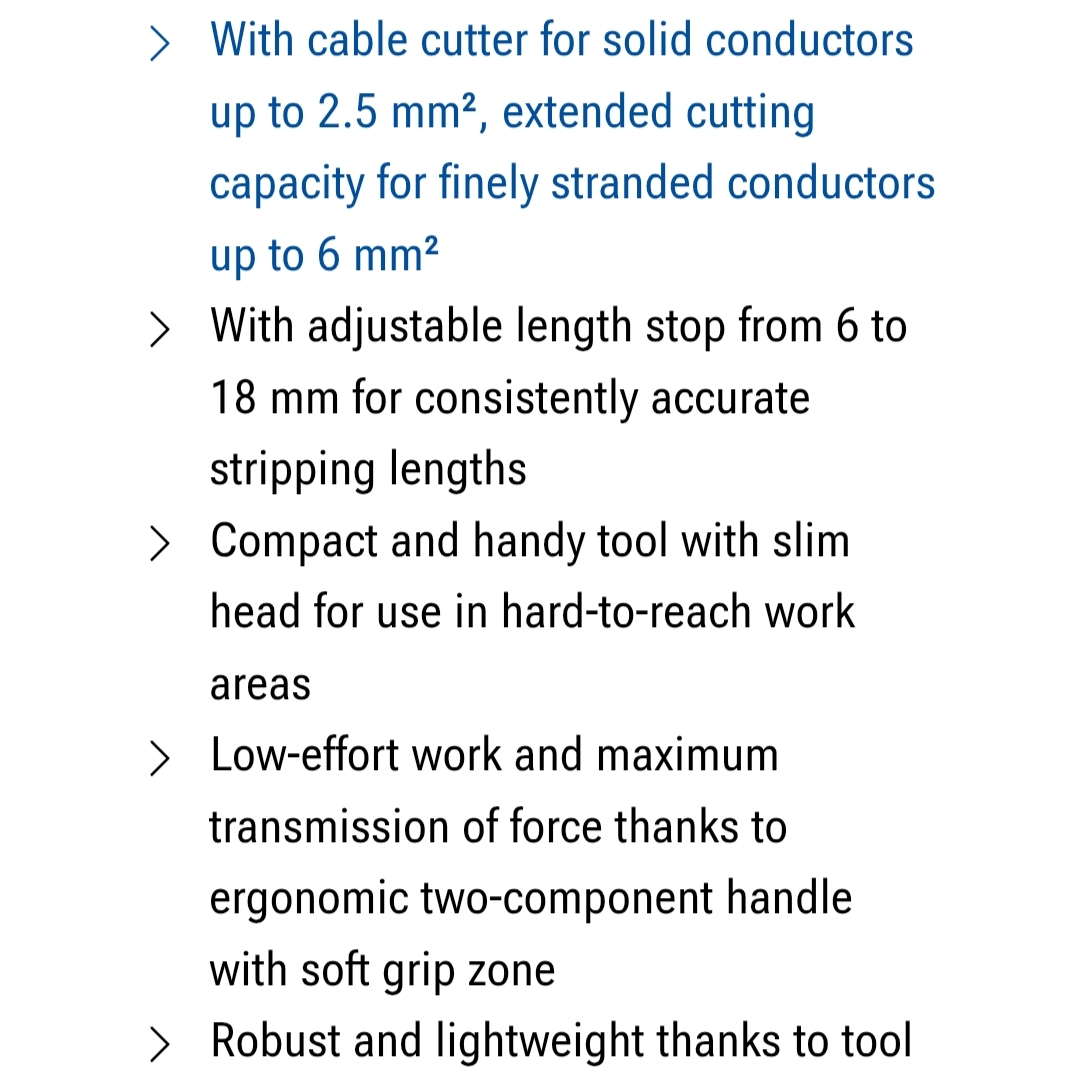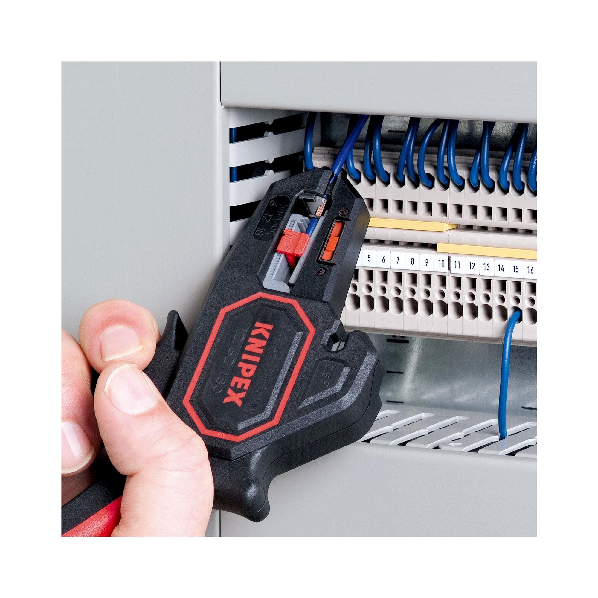 دستگاه به صورت اتوماتیک سیم ها را تا 6 میلی متر مربع بدون هیچ تنظیمی با سرعت و دقت بالا و بدون اینکه سیم هیچ آسیبی ببیند لخت میکند و خودش بر اساس سایز سیم مورد نظر تنظیم میشود.