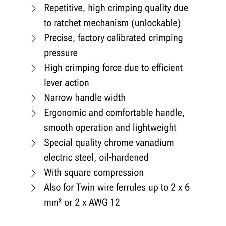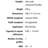 دسته ارگونومیک و استفاده راحت ،عملکرد روان و وزن سبک،فشرده سازی مربع یا چهارگوش زن،کیفیت بالا ،طول عمر بالا،پرس با کیفیت با تکرار سریع ،پرس در محدوده ی AWG28-5 از ویژگی های محصول میباشد.